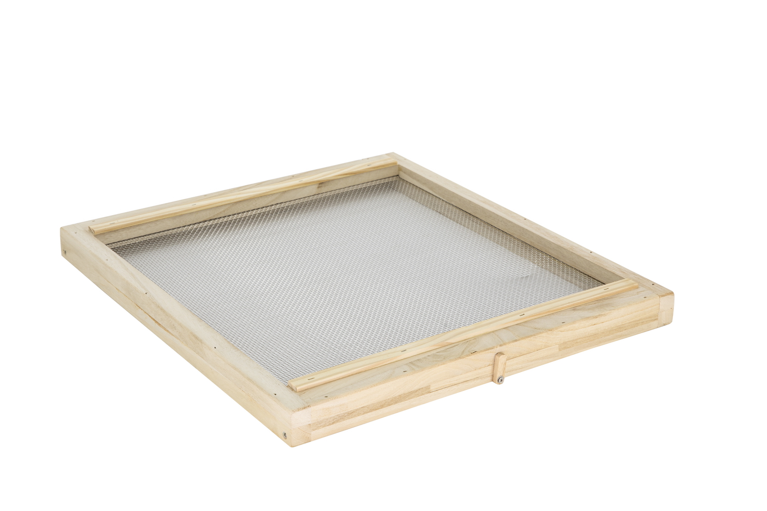 bestehend aus Doppel-Holzrahmen mit Flugloch, herausnehmbarer Zwischenbodenplatte mit zwei Spundlöchern, Abdeckungen und runden Bienenfluchten, Drahtrahmen mit Lüftungsgitter. Somit 6-fach nutzbar: Fluchtschied, Zwischenboden mit Rüsselkontakt, geschlossener Zwischenboden, Oberlüfter, Oberflugloch und Futtergitter