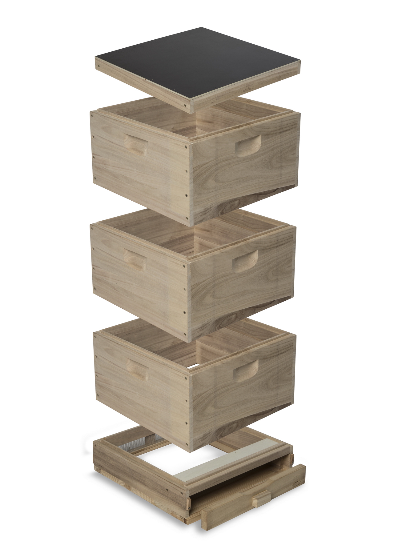 bestehend aus: drei Ganzzargen für 11 Rähmchen DN ein isolierter Holzdeckel ein Hochboden Höhe 85 cm, Gewicht ca. 14 kg ohne Zubehör