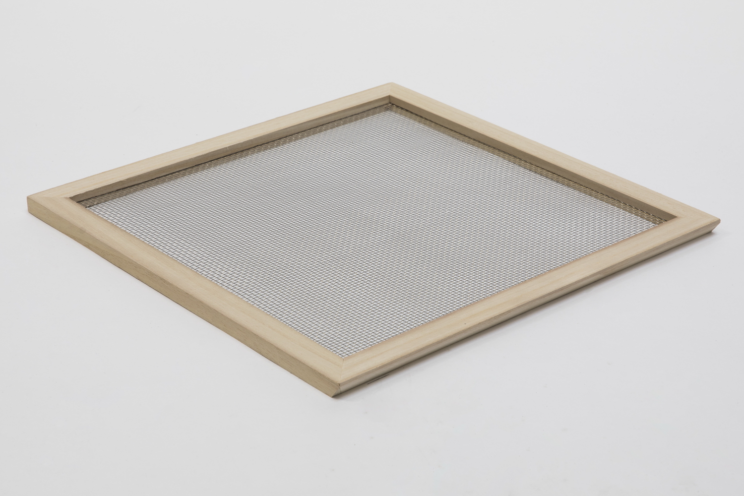 zweiteilig, bestehend aus einem Unter-Holzrahmen mit Flugloch und eingefasstem, feinem Edelstahlgitter und einem Ober-Holzrahmen mit eingefasstem Aluminium-Varroa-Durchfallgitter