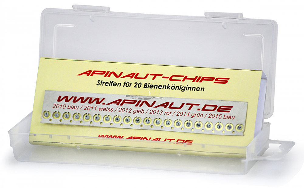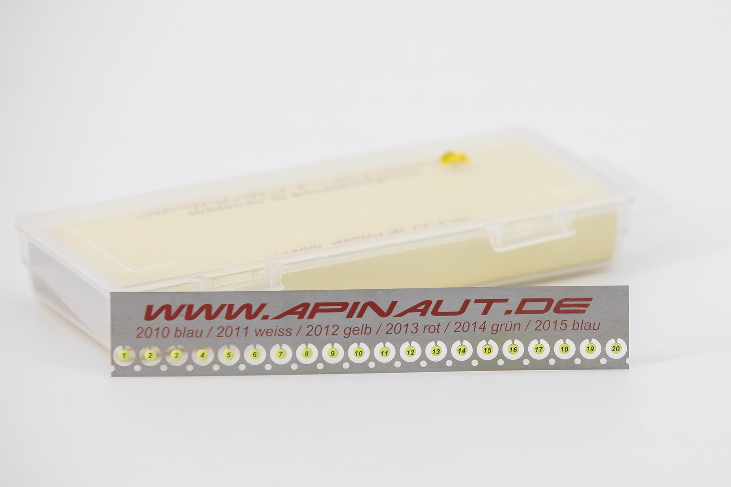 Königinnen Zeichenplättchen -Chips-, nummeriert von 1 bis 20. Hergestellt aus 0,1 mm starkem Spezialstahl werden die Chips mit Opalith Zeichenleim oder Sekundenkleber auf die Königin gebracht.
