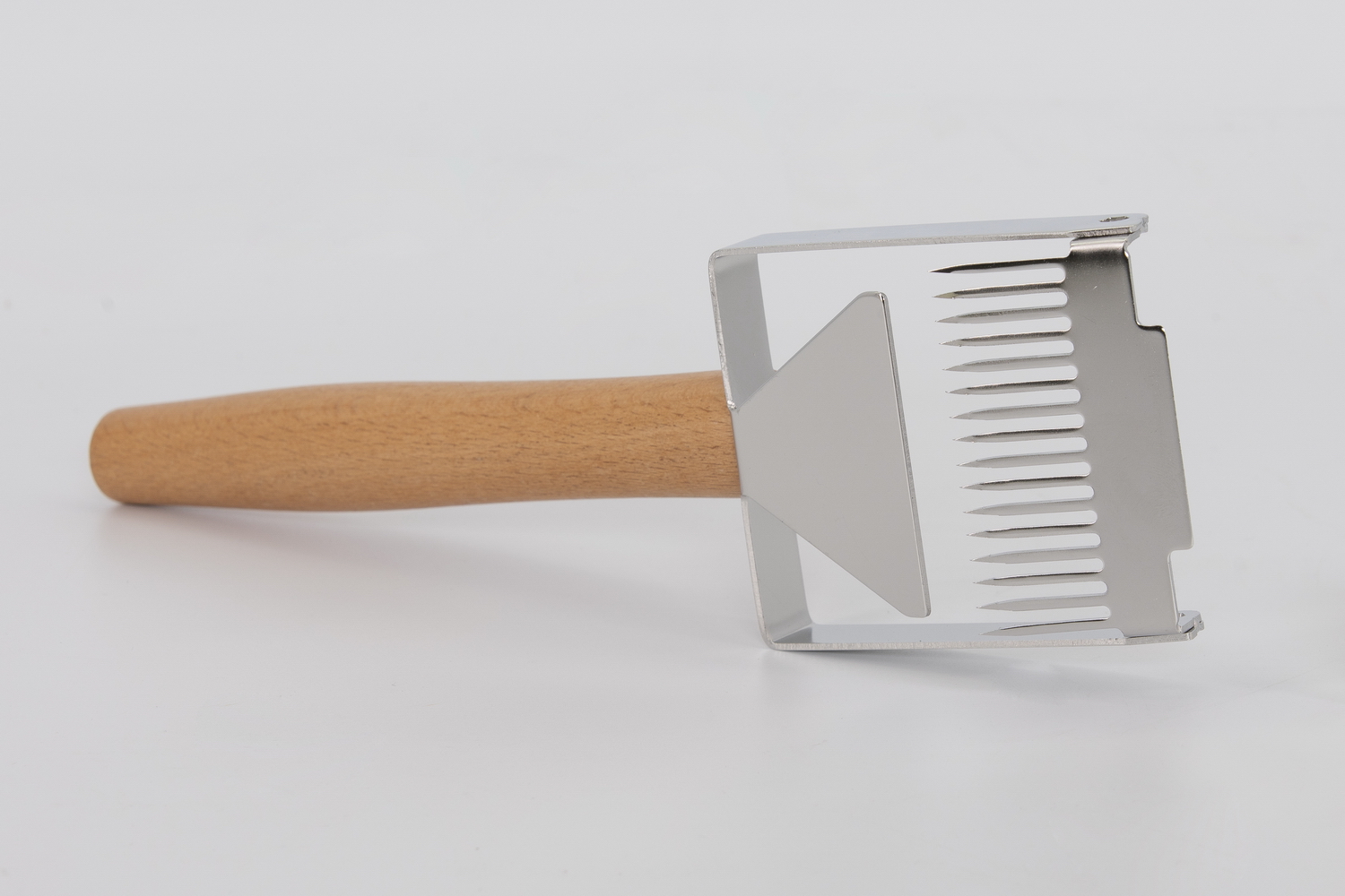 Ziehen statt Schieben. Edelstahl Entdecklungsgabel mit rundem Holzgriff und integriertem Hobel von 6 cm. Somit werden die Zellendeckel abgezogen statt abgeschoben. Zusätzlich befindet sich ein 4 cm langes Messer an der Vorderkante