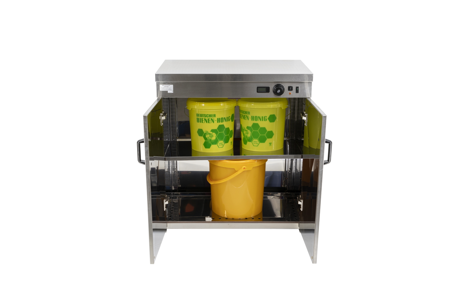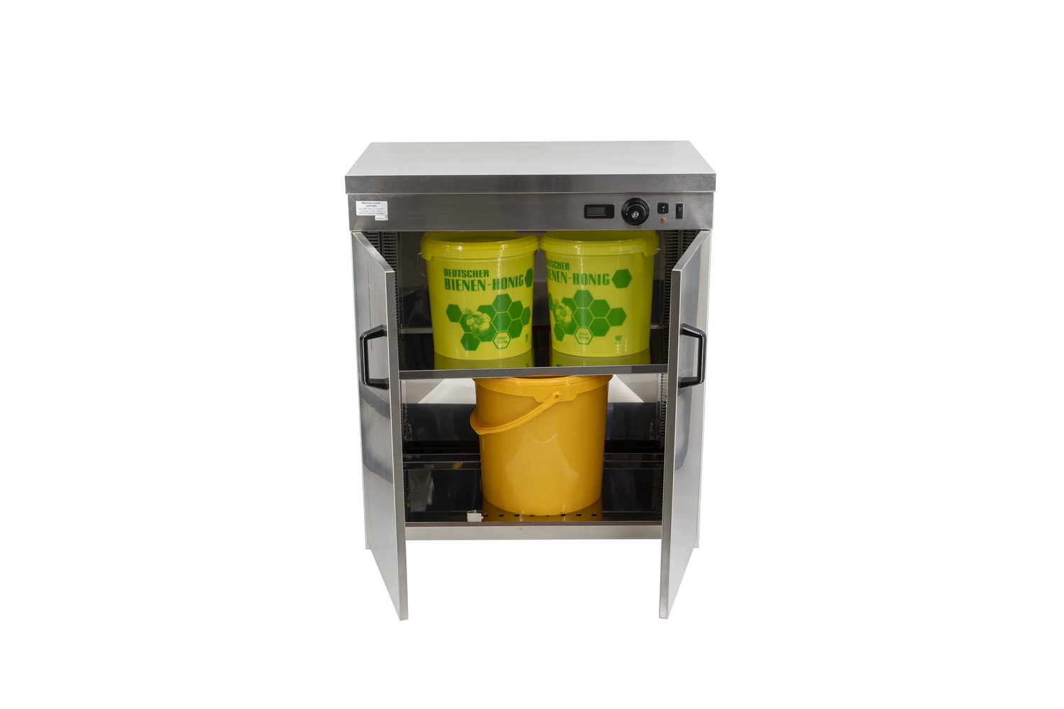 mit Thermostat und integrierter Warmluft-Umwälzung durch ein laufruhiges Gebläse. Die Innenraumtemperatur lässt sich durch ein außen liegendes, digitales Thermometer ablesen. Passend für z.B. zwei ApiNord® Abfüllkübel 50 kg. Im Lieferumfang ist auch ein in der Höhe verstellbarer Zwischenboden enthalten. Dadurch ist Platz für z.B. zwei 25 kg Eimer sowie weitere kleinere Eimer.