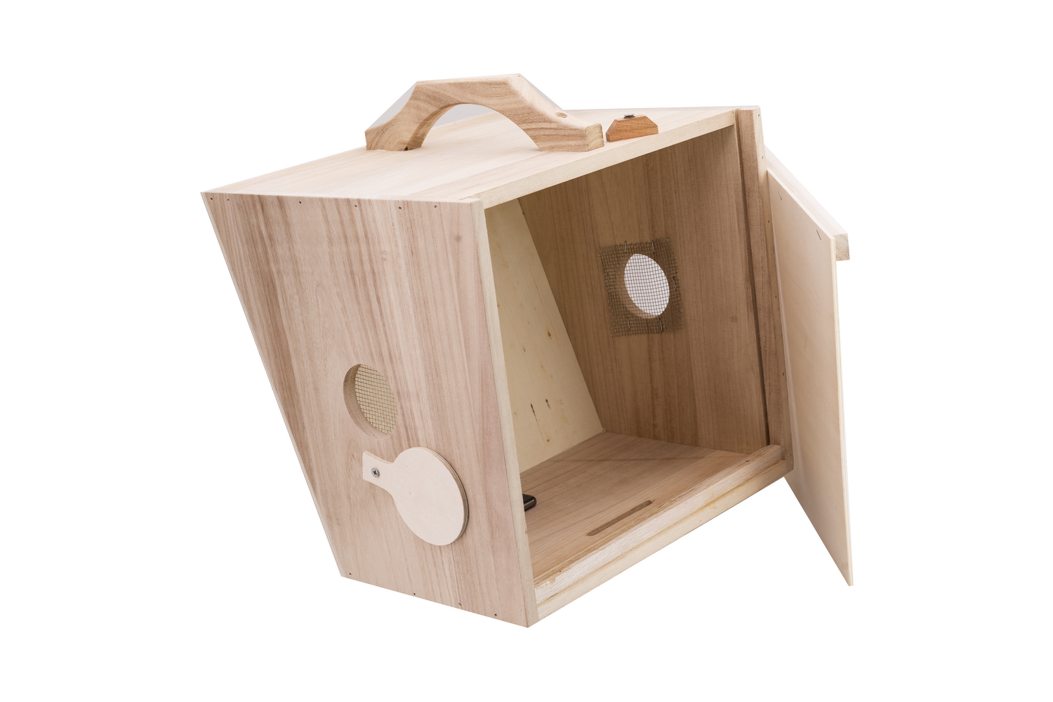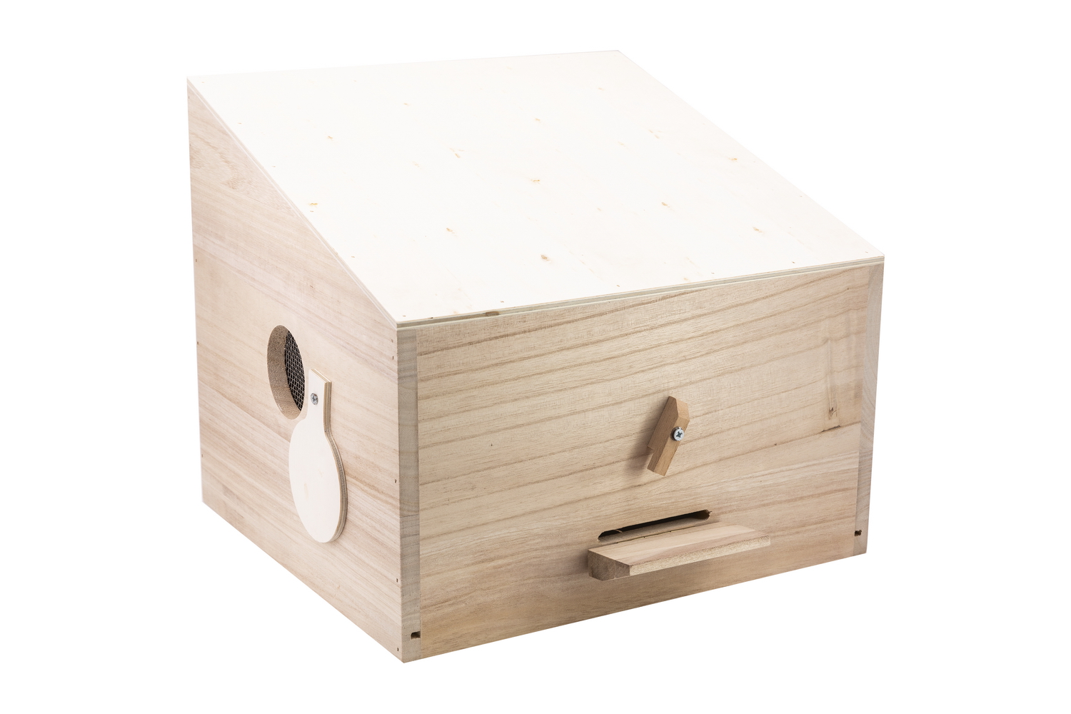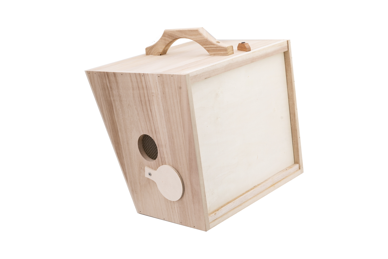 größerer Schwarmfangkasten mit stabilem Handgriff zur Einhandnutzung. Lieferung mit Bodenschieber und verschließbarem Flugloch. Größe ca. 35 x 32 x 30,5 cm
