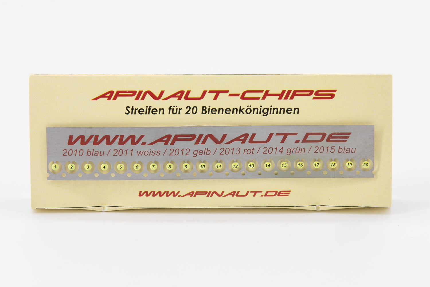 Königinnen Zeichenplättchen -Chips-, nummeriert von 1 bis 20. Hergestellt aus 0,1 mm starkem Spezialstahl werden die Chips mit Opalith Zeichenleim oder Sekundenkleber auf die Königin gebracht.