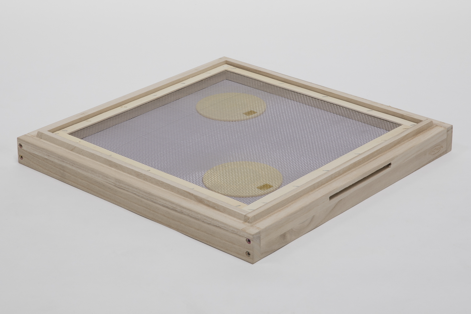 consisting of a wooden frame with flight hole, removable intermediate floor plate with two bung holes, covers and round bee flights, wire frame with stainless steel ventilation grid. Thus 6-fold usable: escape divider, intermediate floor with proboscis contact, closed intermediate floor, upper ventilator, upper flight hole and feeding grid