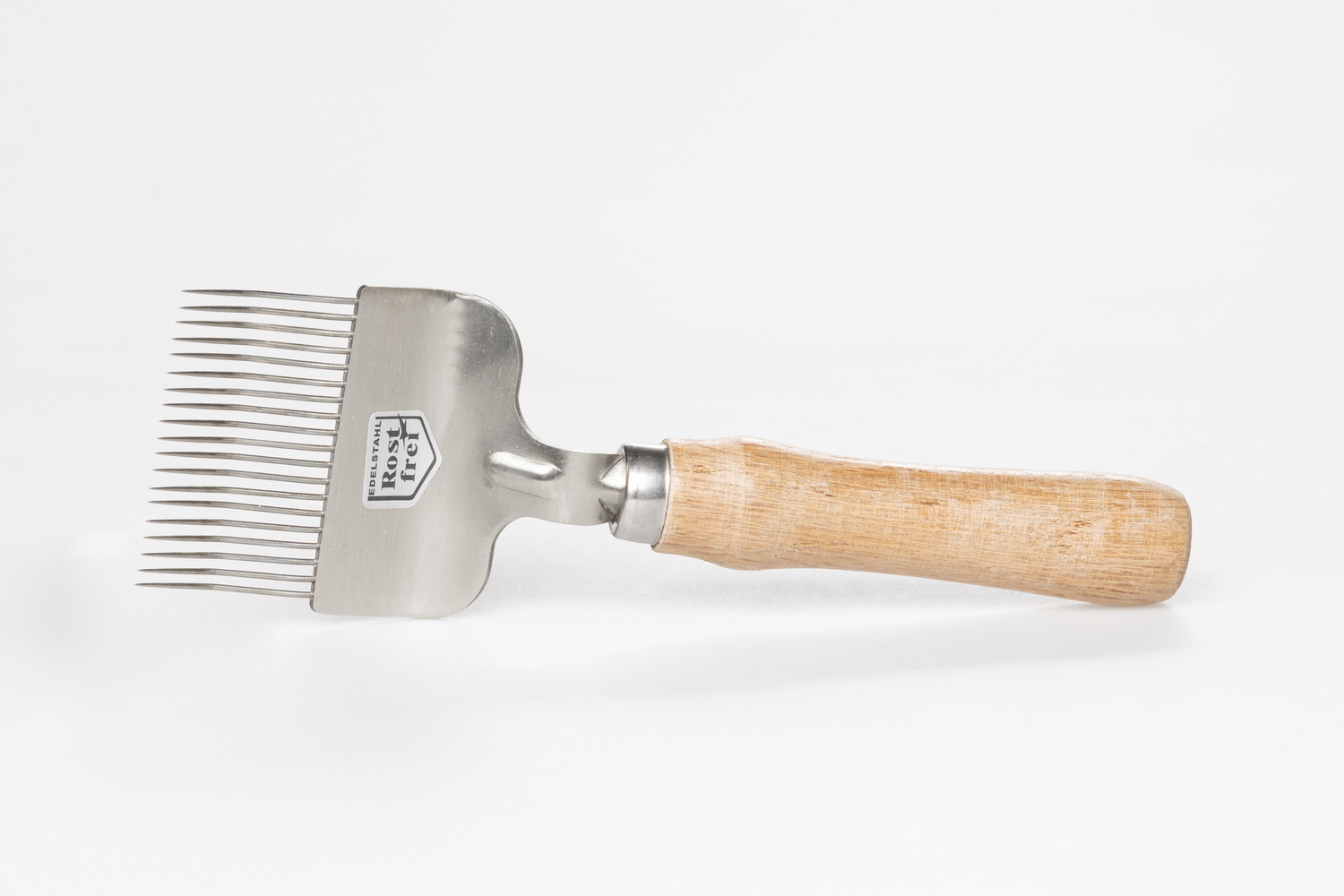 mit gebogenen Edelstahl-Nadeln und rundem Holzgriff