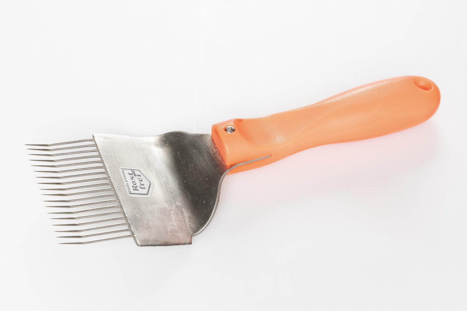 mit gebogenen Edelstahl-Nadeln, neonfarbigem Kunststoffgriff und seitlichem Messer