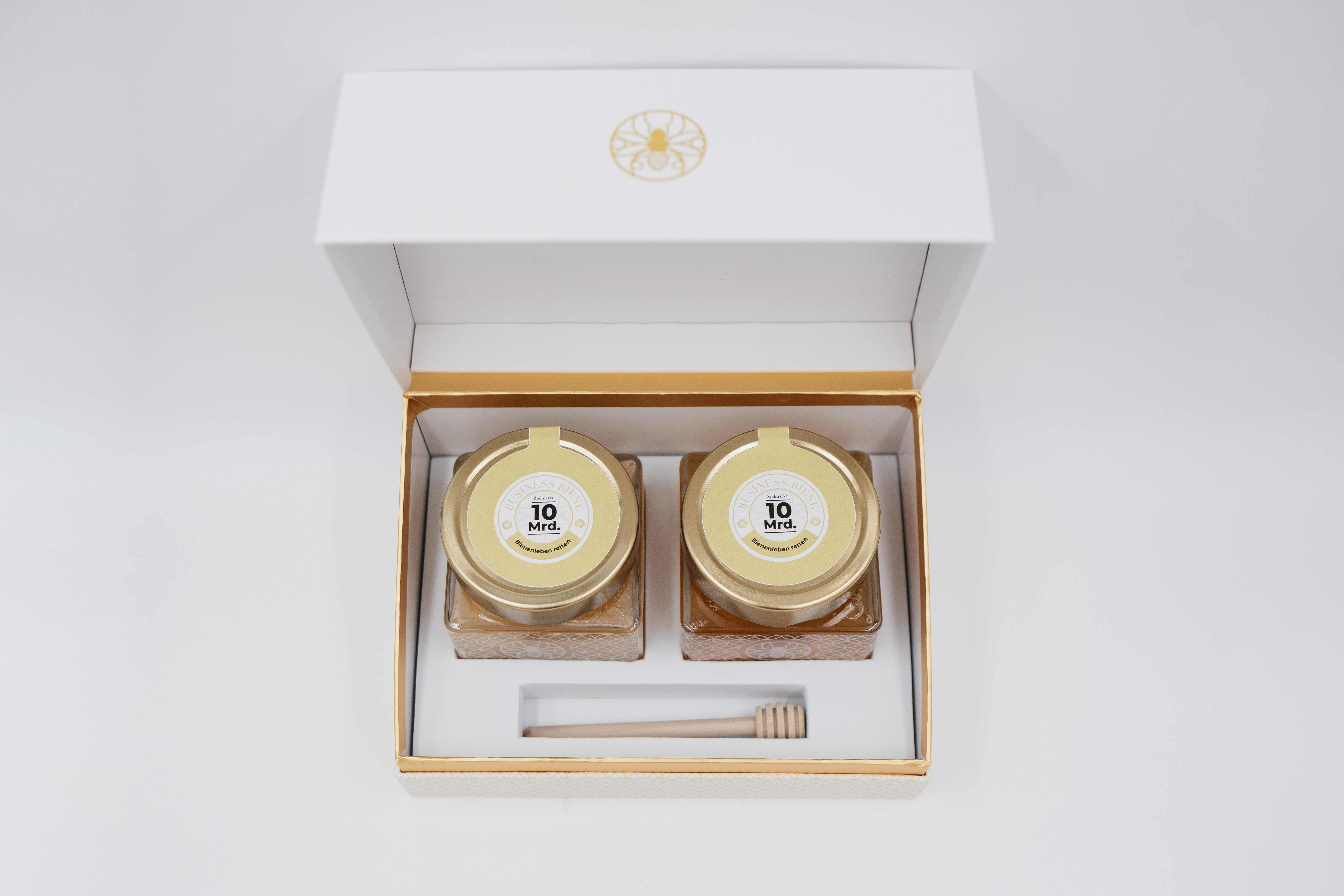 Entdecken Sie unser exklusives Honig Probierset Zweifachset Weiß, ein ideales Geschenk für jeden Anlass. Gönnen Sie sich oder Ihren Liebsten eine besondere Aufmerksamkeit mit unserer Honigbox. Dieses Set, präsentiert in einer eleganten weiß-goldenen Box mit einem auffälligen goldenen Bienenlogo, ist das perfekte Duo aus reinen, naturbelassenen Honigsorten, die sorgsam für den wahren Genießer ausgewählt wurden. Es repräsentiert nicht nur eine festliche Geste der Wertschätzung, sondern ist auch ein Symbol für Raffinesse und Qualität.