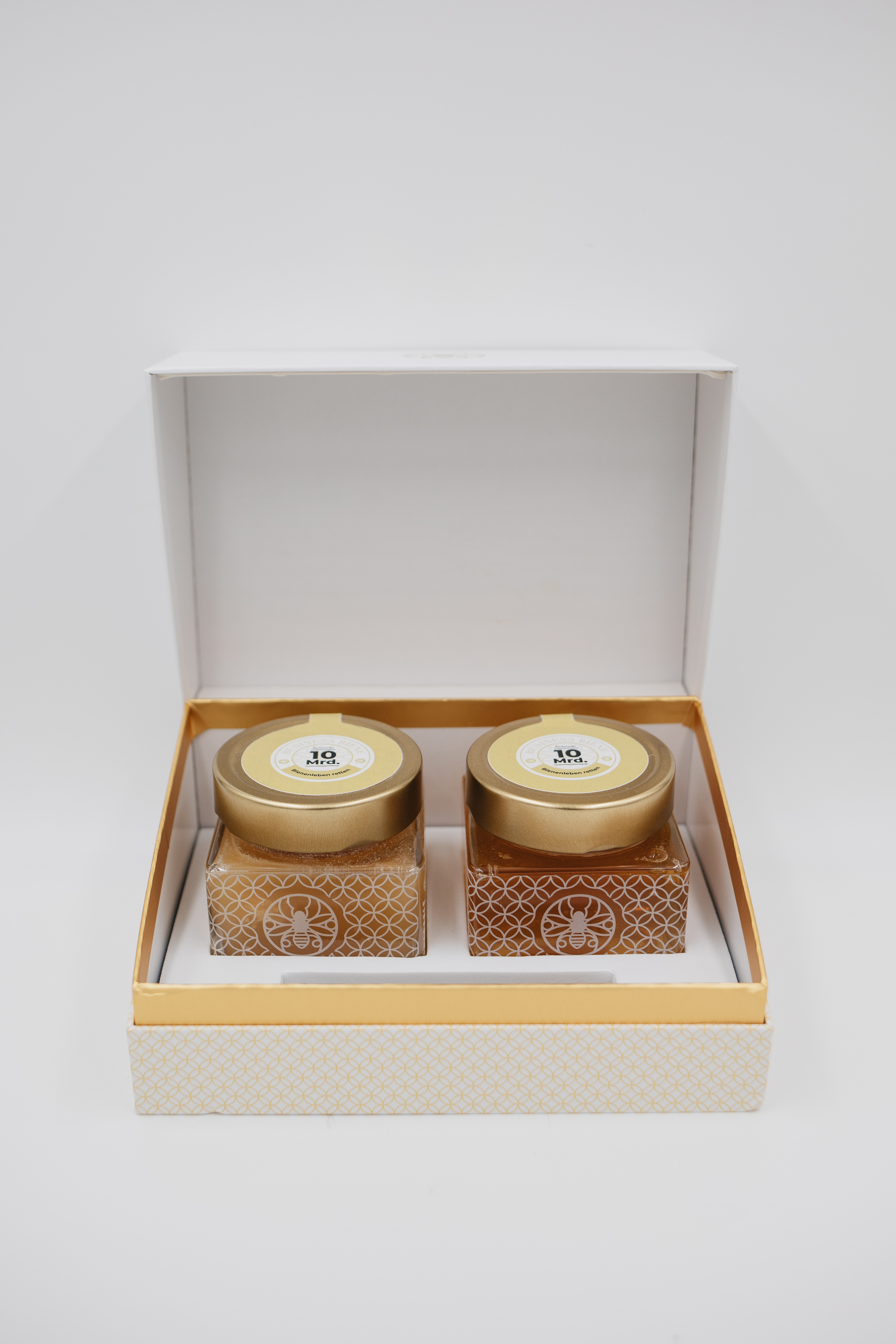 Unser Probierset enthält zwei Gläser ausgewählten, naturbelassenen Honigs, die sorgfältig in unserer stilvollen Box arrangiert sind. Dieses Set ist perfekt für diejenigen, die die Vielfalt des Honigs kennenlernen und genießen möchten. Jedes Glas ist ein Fenster in die faszinierende Welt des Honigs, mit Geschmacksnoten, die von der jeweiligen Blütenquelle abhängen.