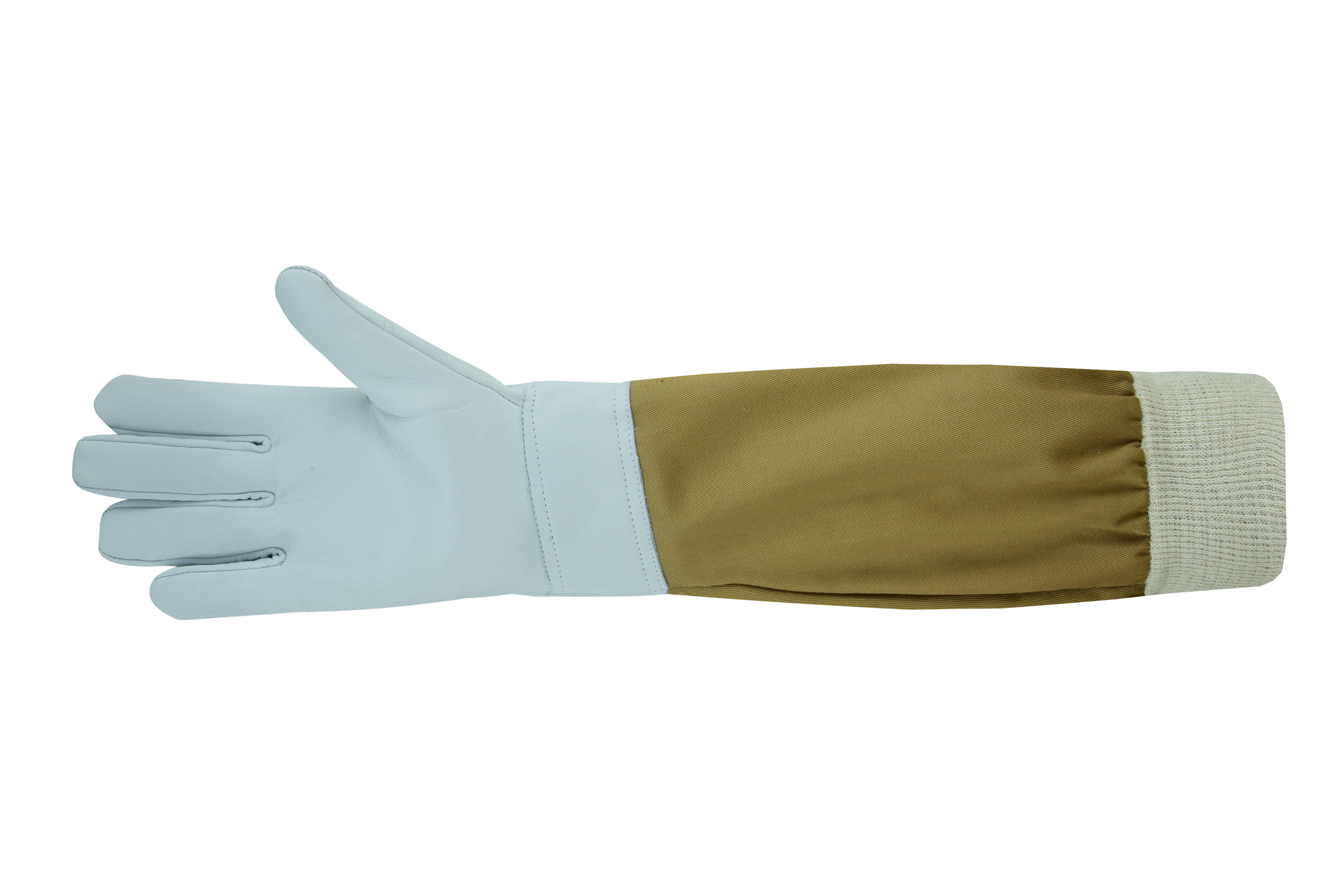 Weiße Leder-Imkerhandschuhe mit Khaki-Stulpen
