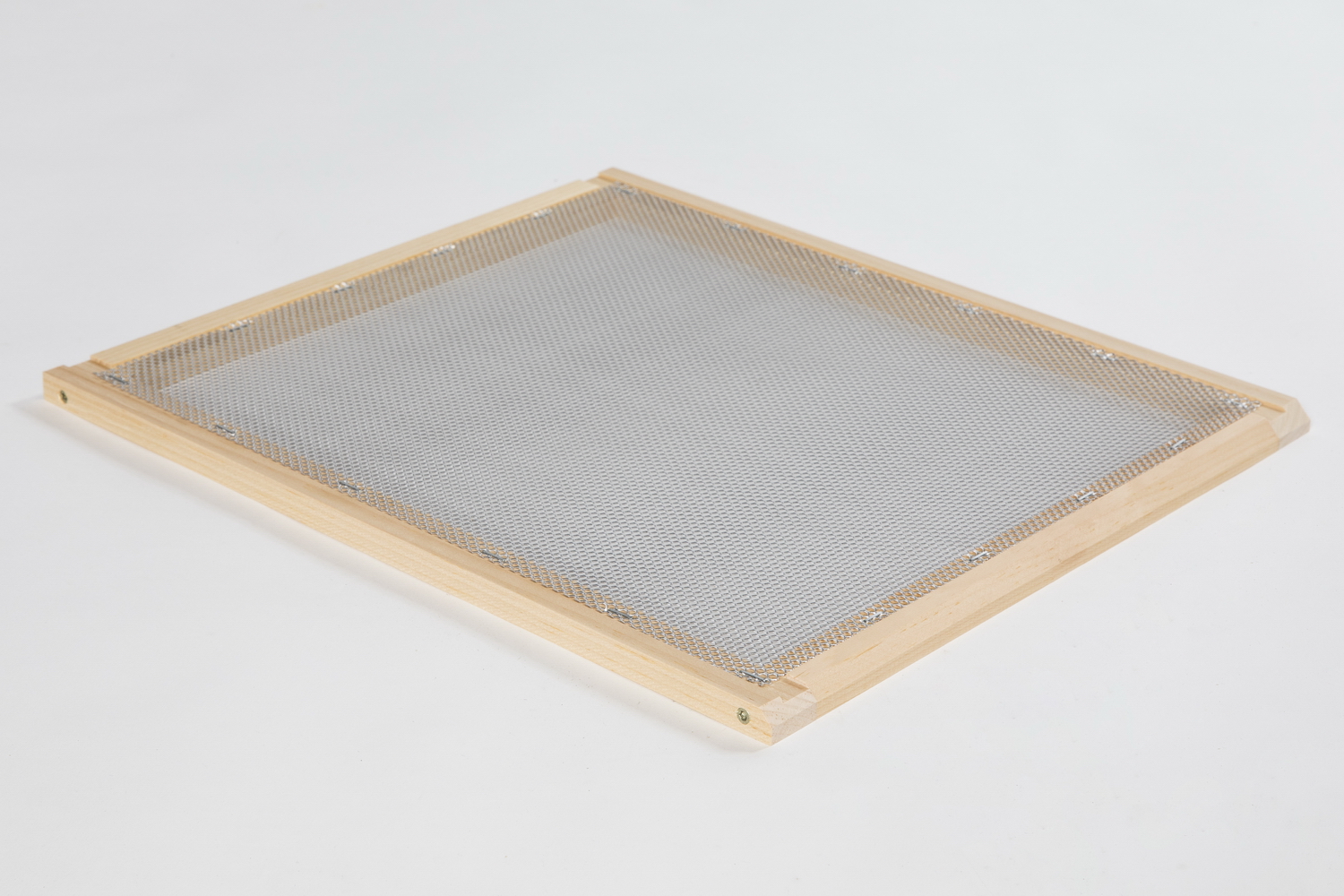 zweiteilig, bestehend aus einem Unter-Holzrahmen mit Flugloch und eingefasstem, feinem Edelstahlgitter und einem Ober-Holzrahmen mit eingefasstem Aluminium-Varroa-Durchfallgitter Außenmaß ca. 520 x 420 mm