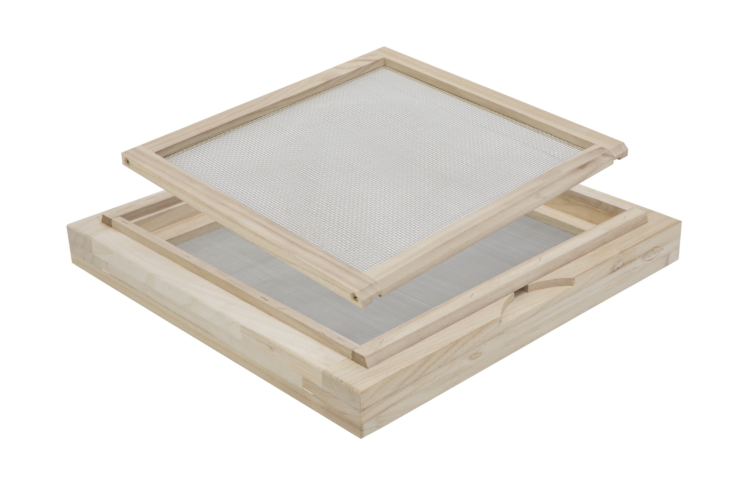zweiteilig, bestehend aus einem Unter-Holzrahmen mit Flugloch und eingefasstem, feinem Edelstahlgitter und einem Ober-Holzrahmen mit eingefasstem Aluminium-Varroa-Durchfallgitter